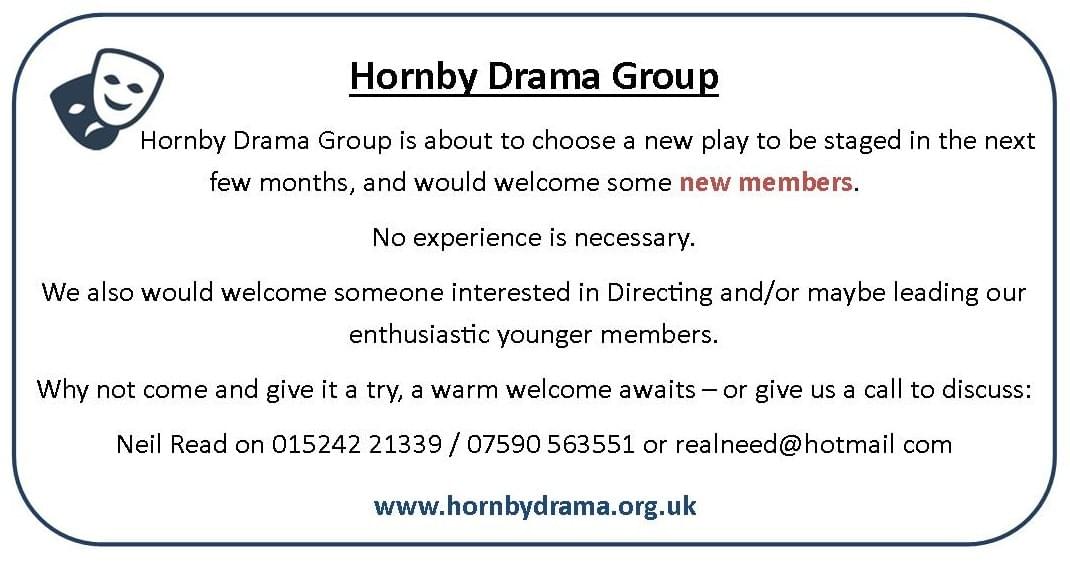We're a long-established amateur drama group. We stage shows on the well-equipped stage at Hornby Institute in Hornby, near Lancaster.